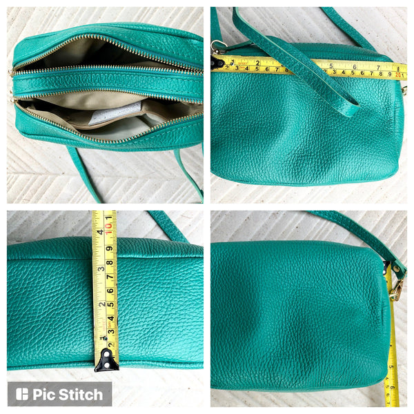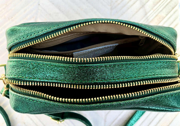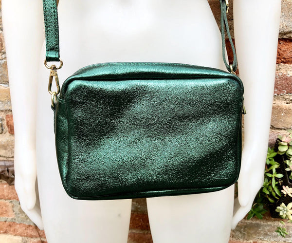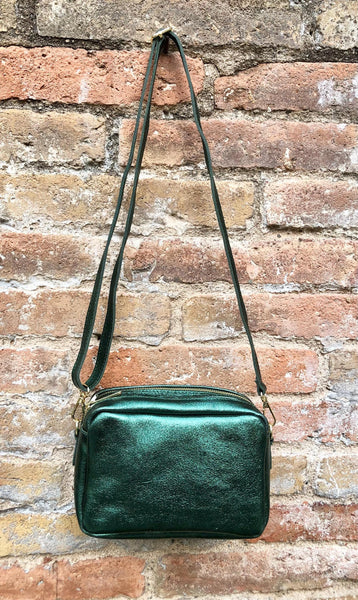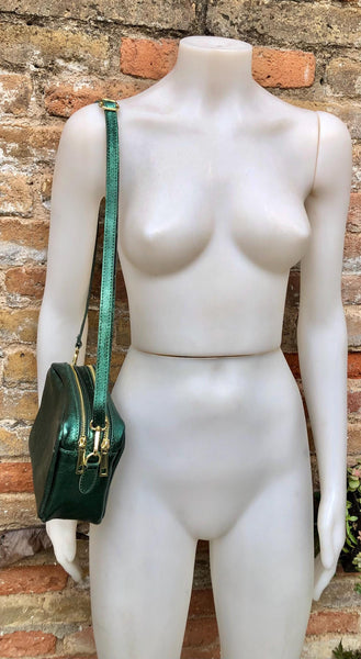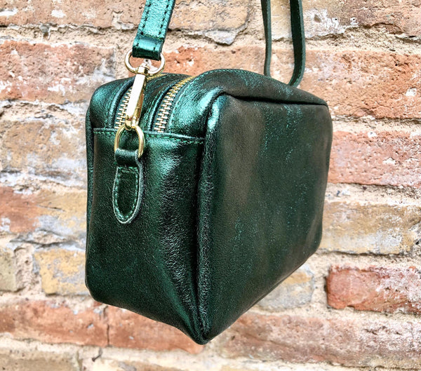 Small leather bag in metallic green. Genuine leather cross body / shoulder bag. Dark green glitter purse. Adjustable strap. Gold accents