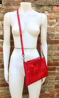 Leather bag in RED with 2 different adjustable and removable straps included: one embroidered "guitar" strap in a beautiful geometric design and another strap in the same genuine RED leather as the bag.