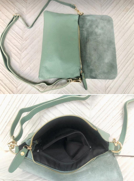 Leather bag in sage GREEN Natural, soft genuine leather. Small cross body bag in soft but strong leather. BOHO, Festival cross over bag..Closed by a zipper and also a leather flap.
