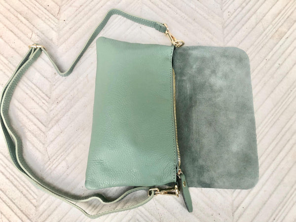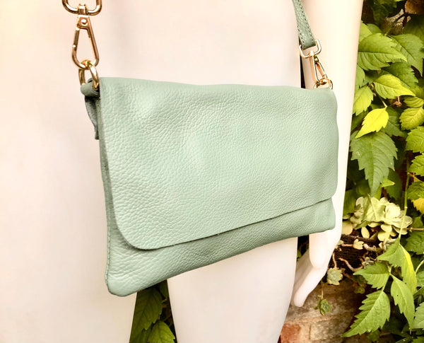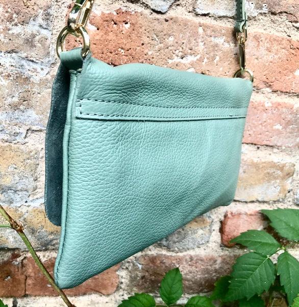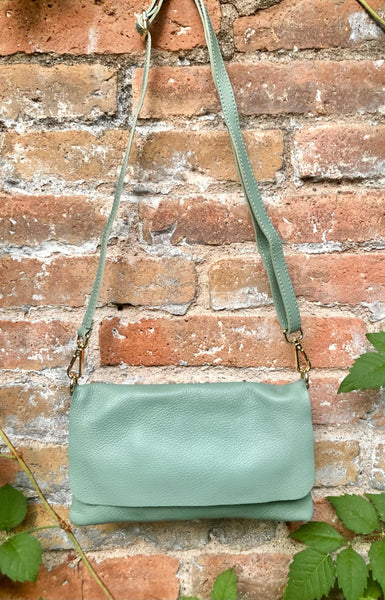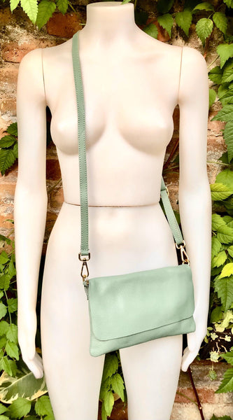 Small leather bag in sage green. GENUINE leather cross body / shoulder bag in light green leather bag with adjustable strap, zipper and flap