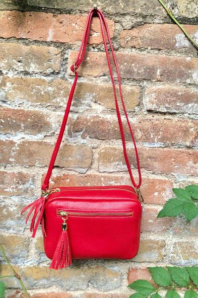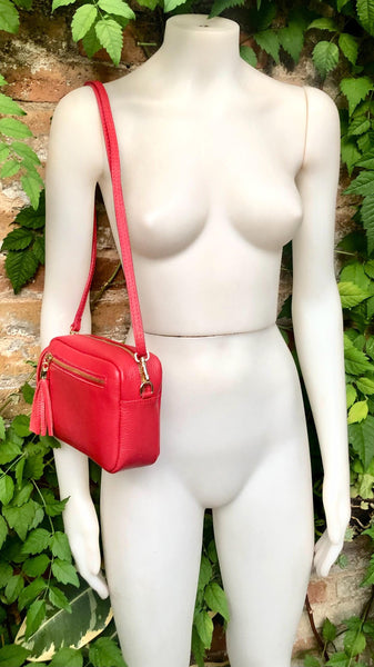 Small red leather bag. GENUINE leather shoulder / cross body bag. Bright red leather purse with tassels, adjustable strap and zipper.