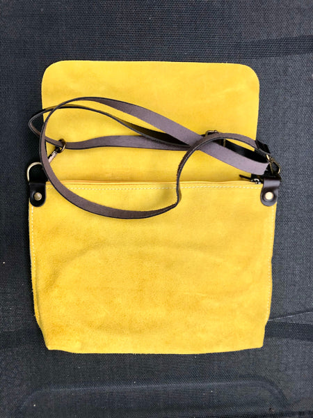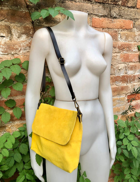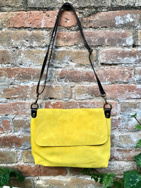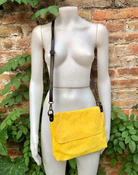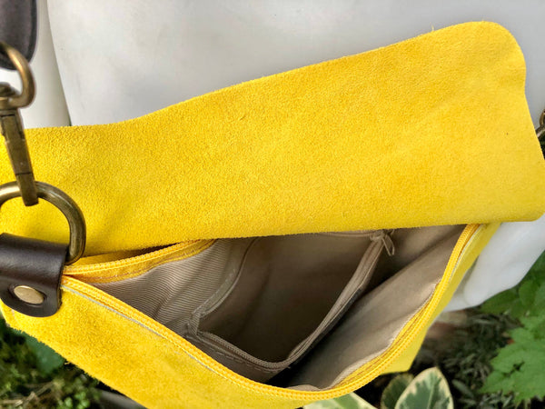 Boho leather bag in bright yellow suede . GENUINE leather. Soft suede leather cross body or shoulder bag. Yellow messenger leather bag. Adjustable genuine suede leather straps, closed by zipper and flap.