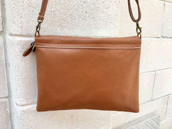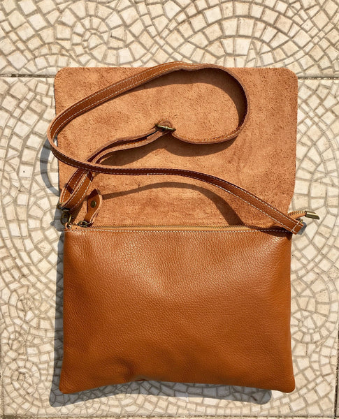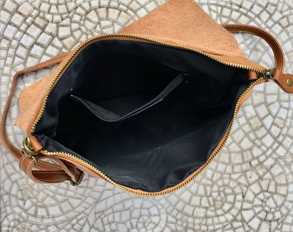 Cross body bag in grain leather. CAMEL BROWN boho bag . Natural genuine grain leather. Cross over, small messenger bag in TOBACCO BROWN . Large enough to fit your purse, keys, cellular and small cosmetics bag. Saddle BROWN messenger bag. The inside of the bag is lined in a strong nylon-cotton mix fabric with a zipper pocket inside .