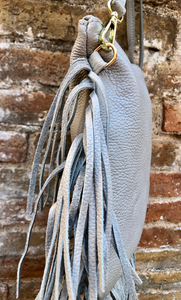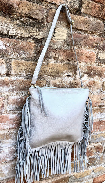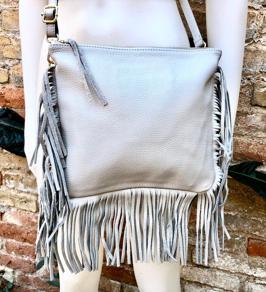Crossbody or shoulder bag in genuine leather with long fringes. Light GRAY boho bag . GRAY natural leather. Medium sized messenger bag. Large enough to fit your purse, keys, cellular and small cosmetics bag. Hippy bag with fringes.