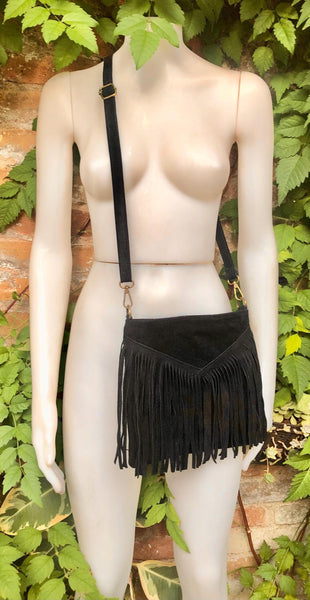 Cross body bag in suede leather with fringes.BLACK boho bag . BLACK natural genuine suede leather. Medium sized messenger bag. Large enough to fit your purse, keys, cellular and small cosmetics bag. Hippy bag with fringes.