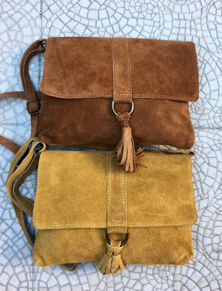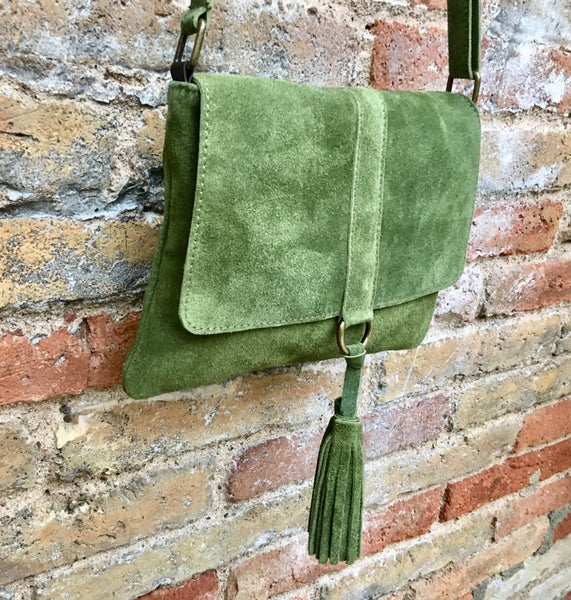 Cross body bag in suede leather. Moss green boho bag with tassel and flap . Natural genuine suede leather. Cross over, small messenger bag. Large enough to fit your purse, keys, cellular and small cosmetics bag.