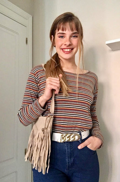 The bag is closed by a zipper on its upper part. Adjustable suede strap.