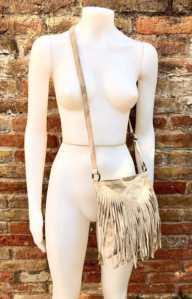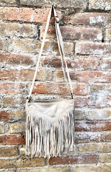 Cross body bag. BOHO suede leather bag in LIGHT beige with FRINGES. Messenger bag in soft genuine suede leather. Crossbody hippy bag