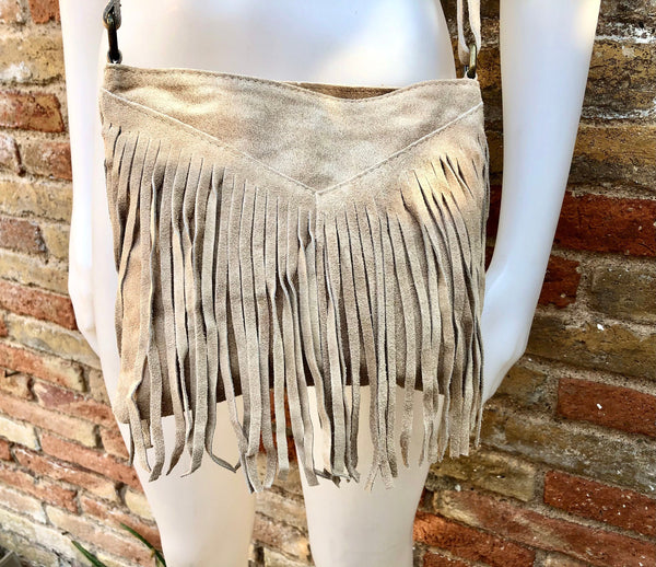 Cross body bag in suede leather with fringes. LIGHT BEIGE boho bag . Dark beige, natural genuine suede leather. Medium sized BEIGE hippy suede bag.