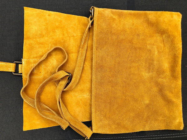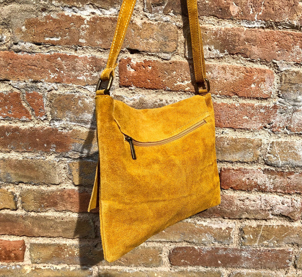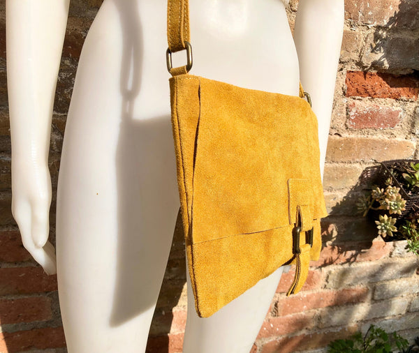 Cross body leather bag in MUSTARD YELLOW . Natural genuine suede leather. Cross over, Messenger bag,large enough for most tablets and books. Boho shoulder bag.