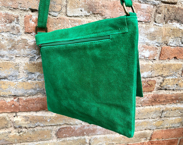 Boho, crossbody suede bag in GREEN. Natural genuine suede leather. Cross over, messenger bag,large enough for most tablets and books