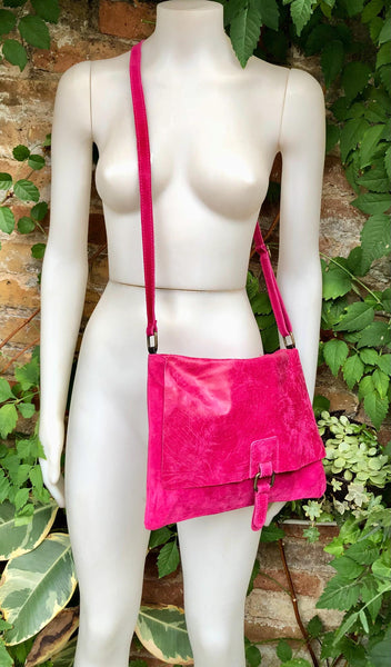 Crossbody or shoulder leather bag in FUCHSIA PINK. Genuine suede leather. PINK soft suede leather