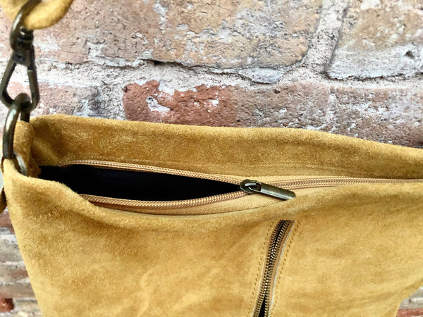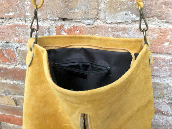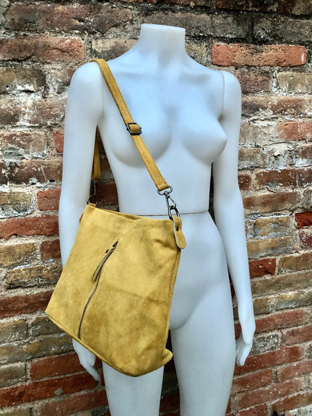 Shoulder or crossbody leather bag in mustard yellow. GENUINE leather. Soft suede leather cross body, shoulder or messenger bag in mustard color.