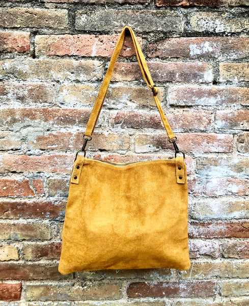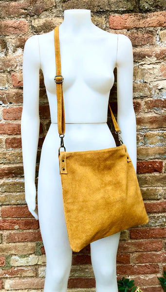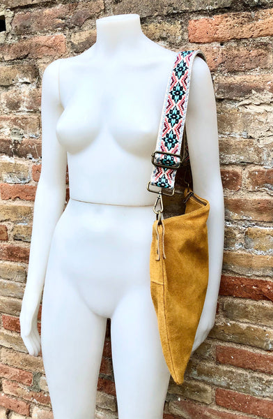 Cross body bag in suede leather with 2 removable adjustable straps: 1 in the same suede as the bag and 1 multicolor guitar strap. Mustard yellow genuine leather bag .Medium sized messenger bag. Large enough to fit a couple of books, an Ipad, your purse, keys, cellular and cosmetics bag