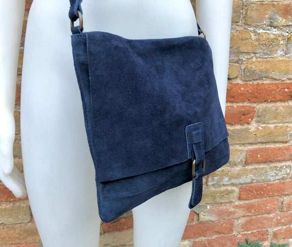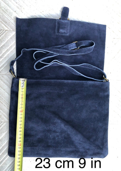 Large enough to fit books and most tablets. Adjustable genuine suede leather straps, closed by zipper and flap.