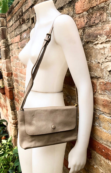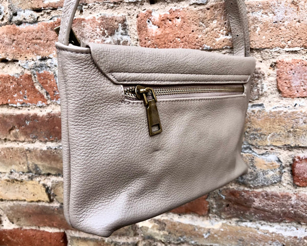 Leather bag in dark BEIGE. Natural, soft genuine leather. Small cross body bag in soft but strong leather. BOHO, Festival cross over bag..Closed by a zipper and also a leather flap.