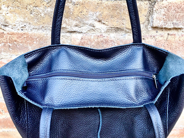 Large tote leather bag in dark blue with Zipper. Genuine leather shopper bag. NAVY BLUE Soft leather shoulder bag. Large enough for books or a laptop, tablet, cosmetics bag etc.