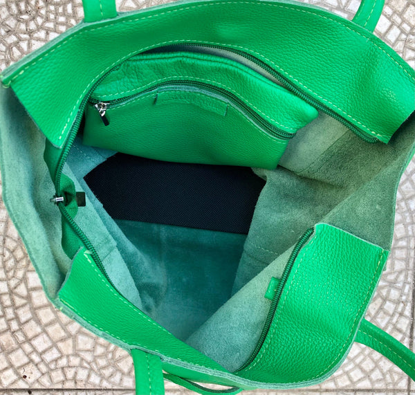 Large tote leather bag in GREEN. Leather shopper in Green closed by a zipper at the top. Large enough for laptops, tablets, books etc. Natural GENUINE leather.