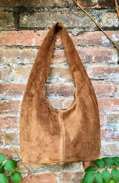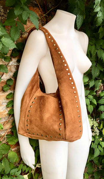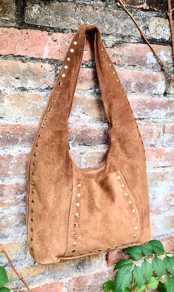 Slouch bag in soft brown suede with tacks. Soft leather shopper. LARGE tote leather bag in CAMEL BROWN with zipper. Natural genuine SUEDE leather. LINED. Light tobacco color carry all bag.