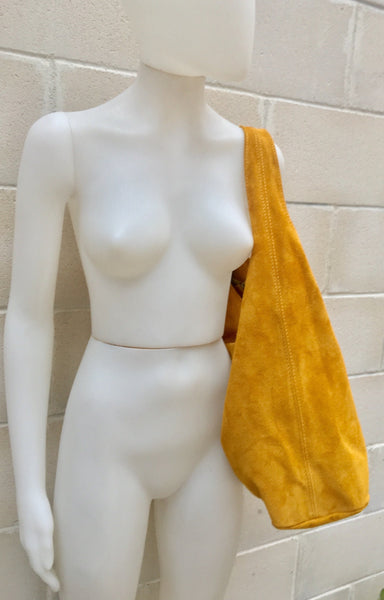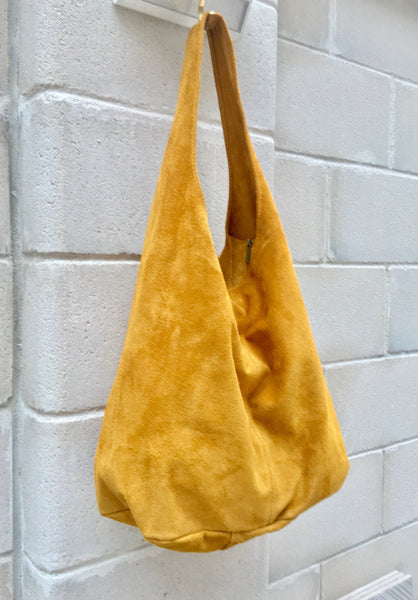Slouch bag. LARGE tote leather bag in MUSTARD YELLOW Natural genuine SUEDE leather HOBO bag. Comfortable wide strap, soft suede leather, easy to carry around.