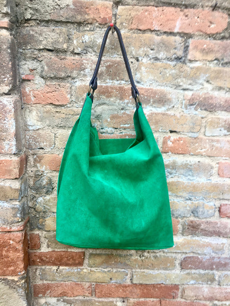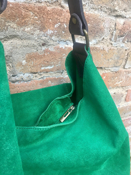 Hobo leather bag in GREEN. Slouch bag in genuine SUEDE leather. This shoulder bag is NOT LINED. We added leather zipper pocket inside and a pouch for your mobile phone. Genuine strong but soft leather wide strap in brown.