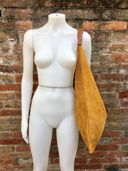 LARGE tote leather bag in Mustard yellow. Slouch bag in genuine SUEDE leather. NOT LINED. We added a small leather zipper pouch for your mobile phone and/or cards or money. It ist attached to the inside of the bag with a piece of suede in the same green color. Genuine leather accent shoulder piece in camel brown.
