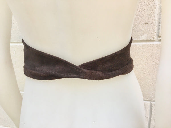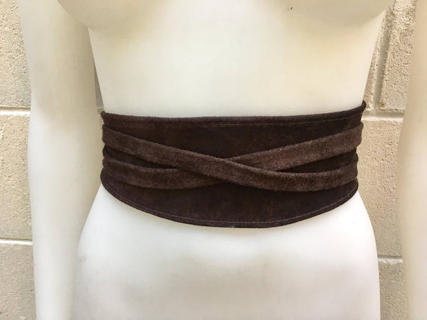 Chocolate brown OBI BELT in natural suede leather. Wrap belt in dark brown. Waist belt in soft natural suede leather. Brown color wraparound belt.