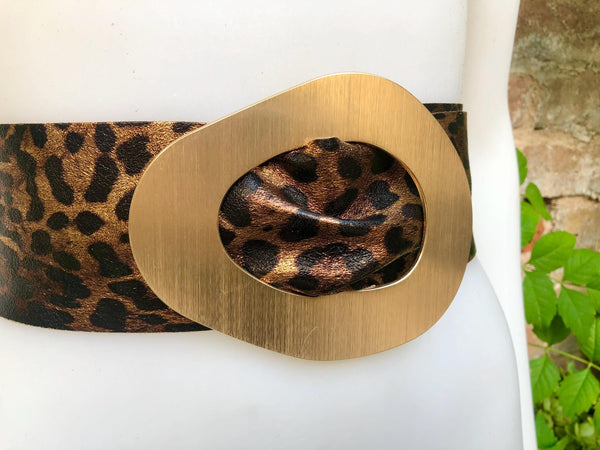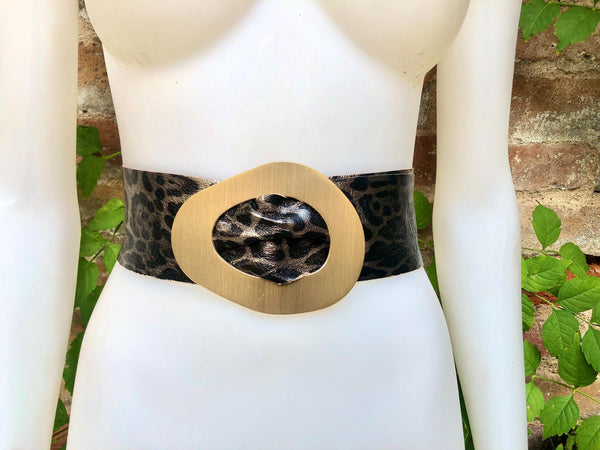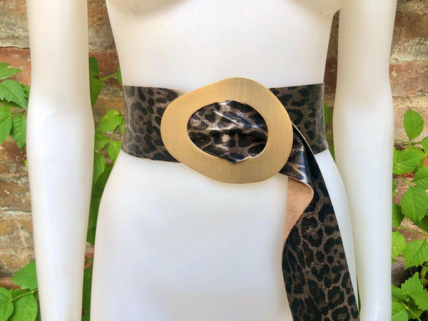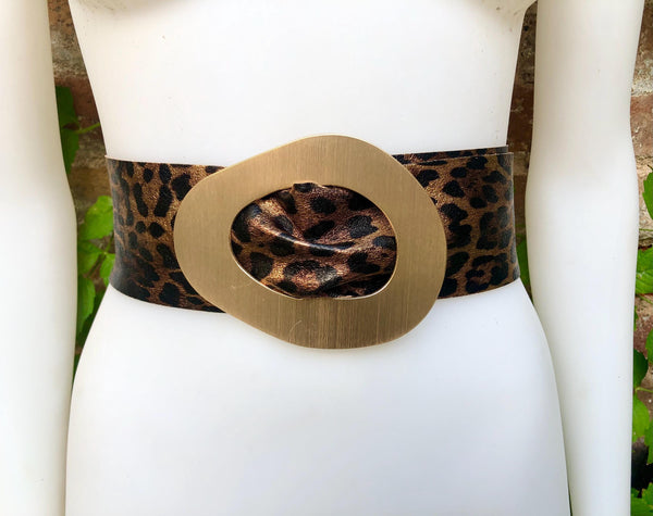CHEETAH print metallic leather waist belt.Large metal buckle in gold. Leopard genuine leather belt. Boho animal print waist /dress wide belt