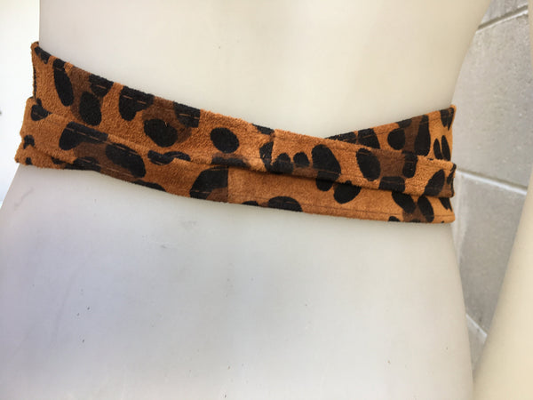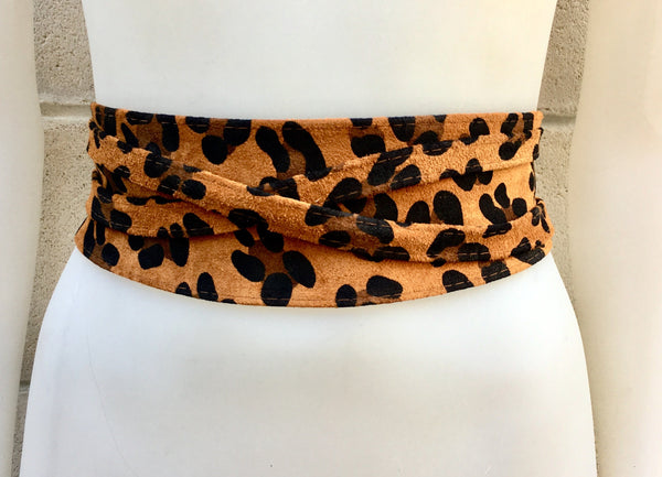 CHEETAH print suede OBI belt . Wrap belt in natural camel brown suede. Genuine leather panther waist belt. Animal print wraparound boho belt