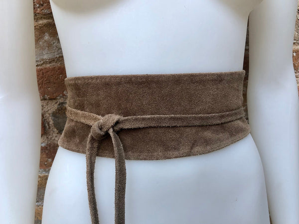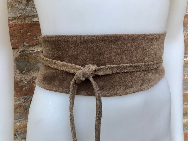 LIGHT BROWN OBI BELT in natural suede leather. Waist belt in genuine leather. Very dark beige suede belt. Taupe or "greyge" color wide dress suede belt.