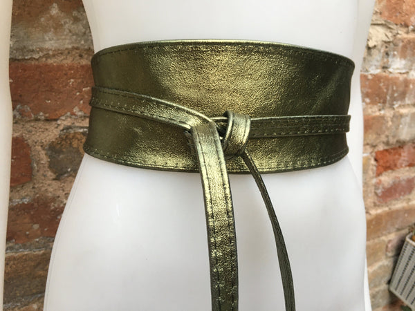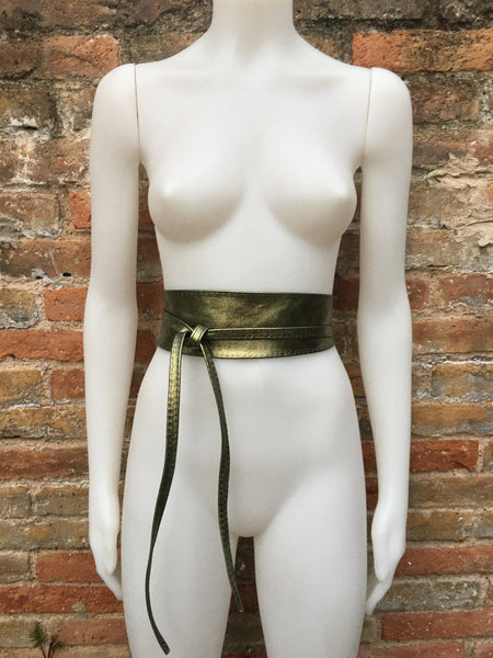 GREEN leather OBI belt. Wide waist belt in soft genuine leather. Metallic shine wraparound belt, boho dress belt in silver color leather.
