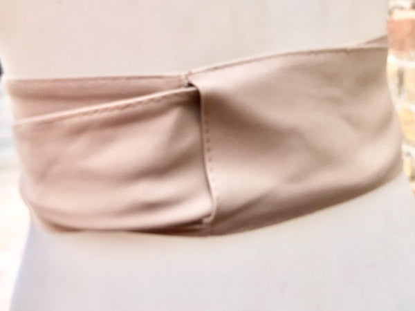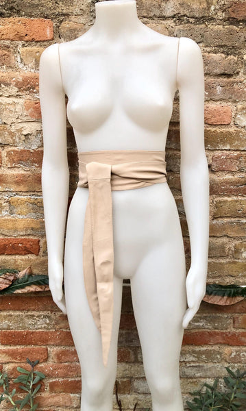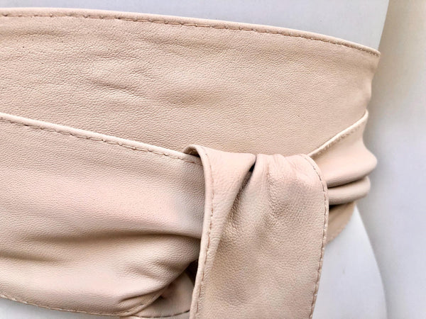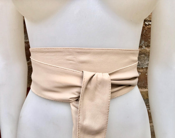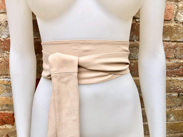 Light peach beige obi belt in natural soft genuine leather. WIDER MODEL wrap belt. Genuine leather waist belt in very light shade of beige. Soft leather creamy white dress belt.
