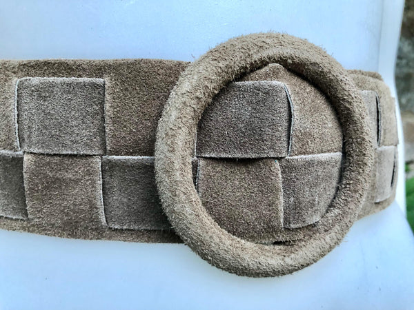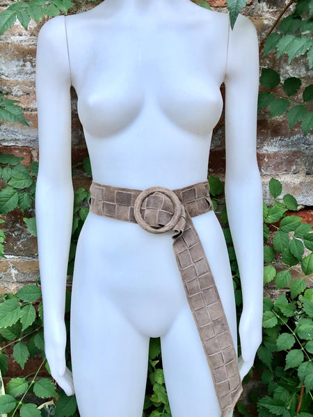 Taupe brown braided wide belt in soft genuine suede leather. Large round buckle, covered in the same color suede.