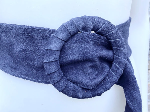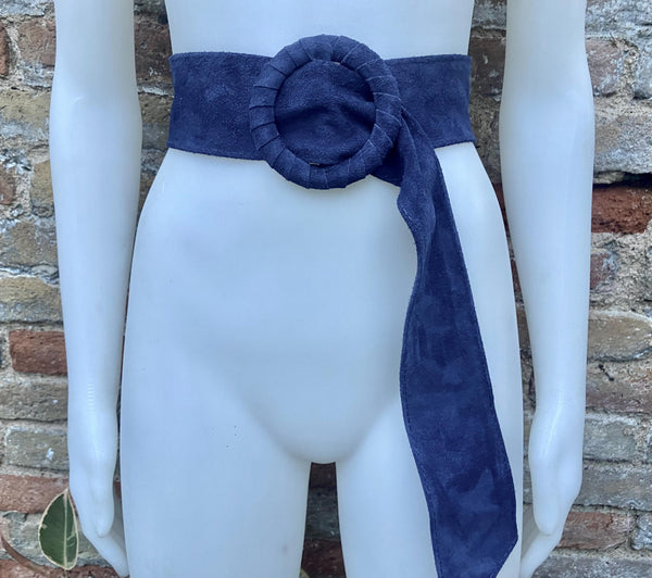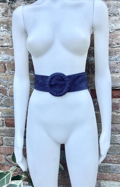 Navy blue suede waist belt with large round buckle. Boho soft suede belt in dark blue. Genuine natural navy blue suede leather