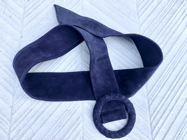 Dark blue belt in soft genuine suede leather. Large round buckle, covered in the same color suede.