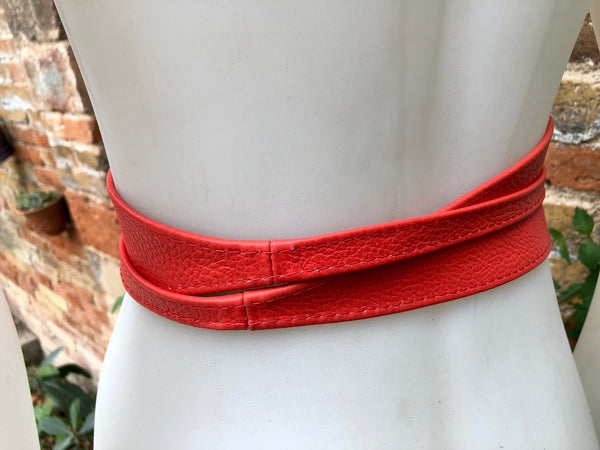 Coral RED OBI BELT in genuine leather. Waist belt in soft natural leather. RED - orange leather belt. Dress or wraparound leather belt.