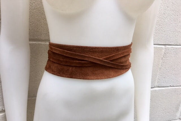 Dark Camel brown OBI BELT in natural suede leather. Wrap belt in dark saddle brown. Waist belt in soft natural suede leather. Dark Tan color wraparound belt.