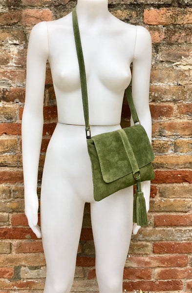 Cross body bag in suede leather. Moss green boho bag with tassel and flap . Natural genuine suede leather. Cross over, small messenger bag. Large enough to fit your purse, keys, cellular and small cosmetics bag.