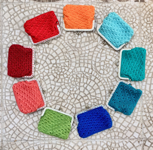 Fits regular credit cards, coins and bills. The purse is hand crocheted and hand sewn to the frame.