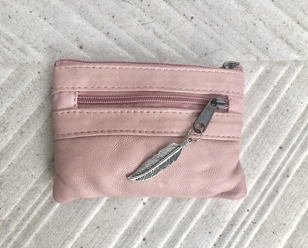 Large enough to fit regular credit cards. Metallic feather charm attached to one of the zippers.