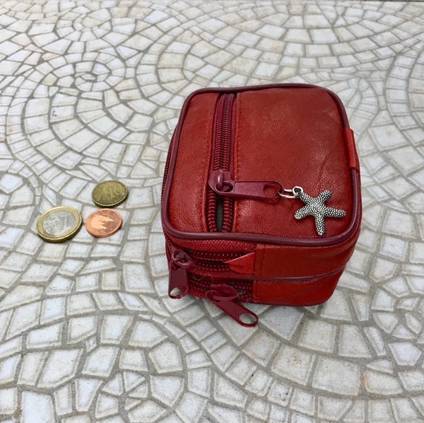 Small RED LEATHER purse with 2 zippers at the top and one more at the side. Genuine leather wallet. Fits credit cards, coins, bills ... Loop at the backside, can be worn attached to a belt as a waistbag or small fannypack. Keyring inside and small metal SEA STAR charm attached to one of the zippers. BELT NOT INCLUDED.