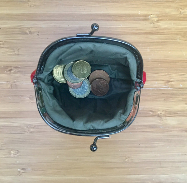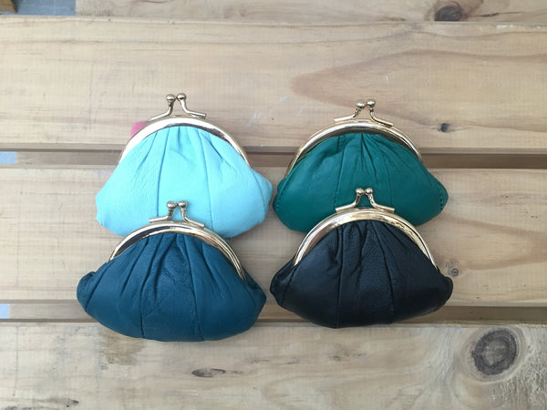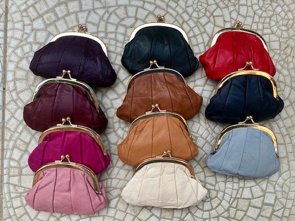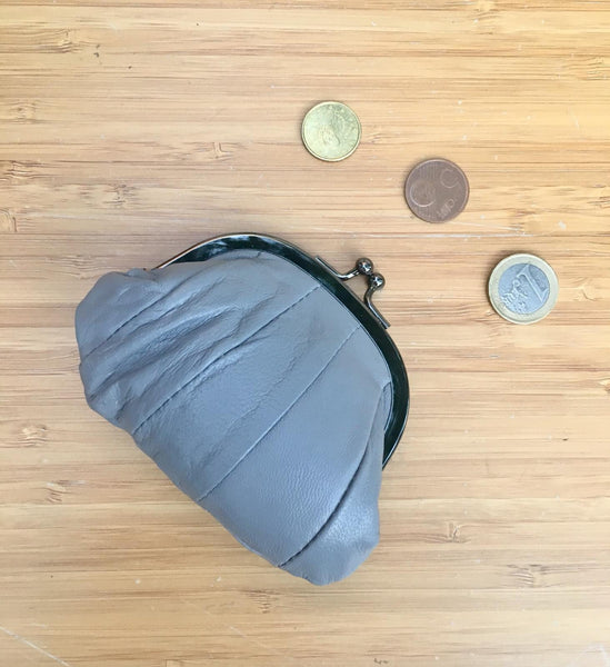 Kiss lock coin purse in soft leather with metallic frame in SILVER. Small clip purse in GENUINE leather. Retro inspired SMALL clip pouch . Lined in a strong nylon fabric. Clip clasp in gold color metal. Vintage , grandma style new purse.