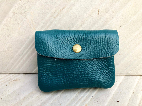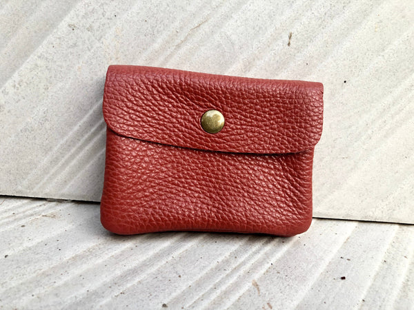 Small genuine leather coin purse in different colors Leather purse or wallet for cards, coins etc closed with a flap and a magnetic snap, 1 more zipper closed pocket inside. Not lined
