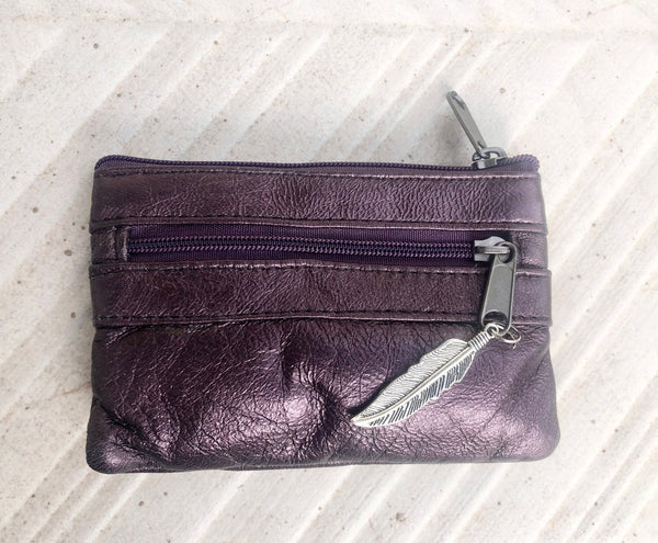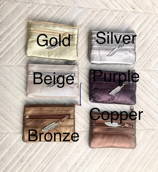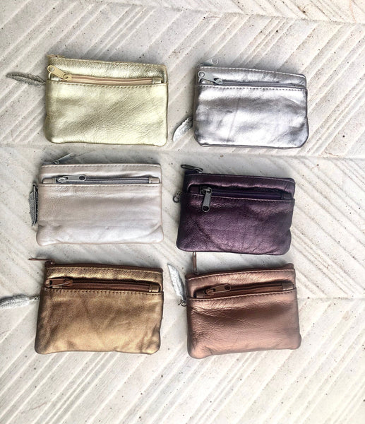 Small genuine leather coin purse in different metallic shine leather colors.