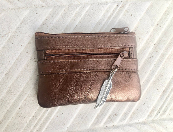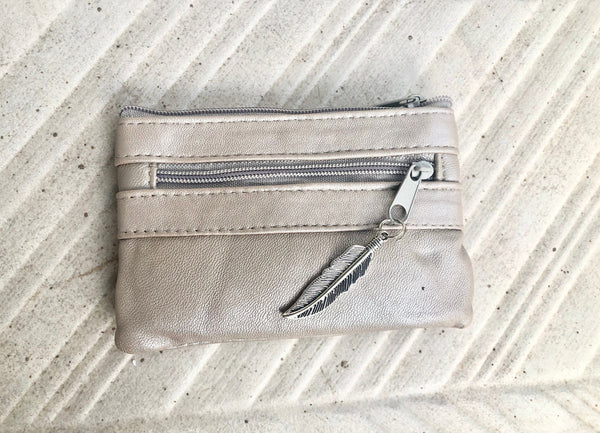 Large enough to fit regular credit cards. Metallic feather charm attached to one of the zippers.