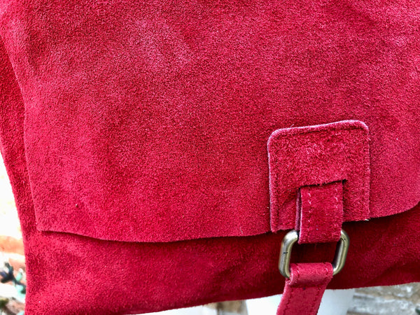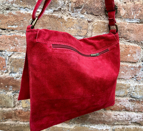 Boho cross body suede bag in RED . GENUINE leather. Soft suede leather cross body or shoulder bag.
