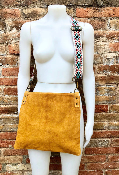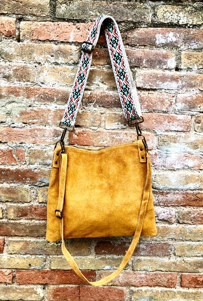 Cross body bag in suede leather with 2 removable adjustable straps: 1 in the same suede as the bag and 1 multicolor guitar strap. Mustard yellow genuine leather bag .Medium sized messenger bag. Large enough to fit a couple of books, an Ipad, your purse, keys, cellular and cosmetics bag