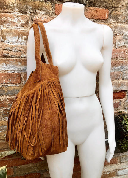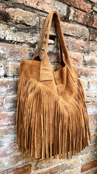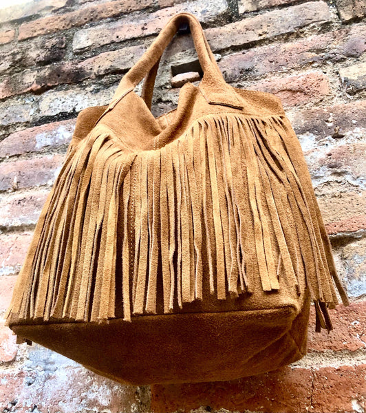 Camel brown fringed shopper bag in genuine suede leather. Saddle brown tote bag for laptops, tablets, books. Brown leather purse + fringes