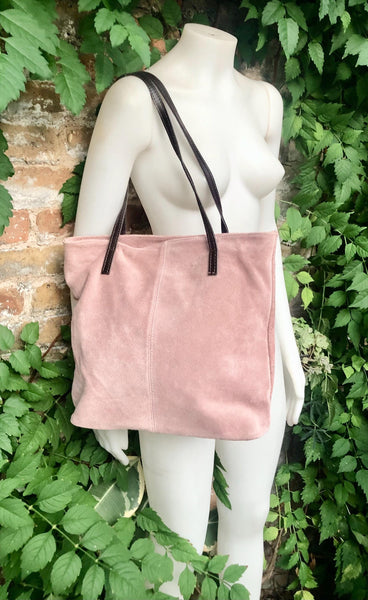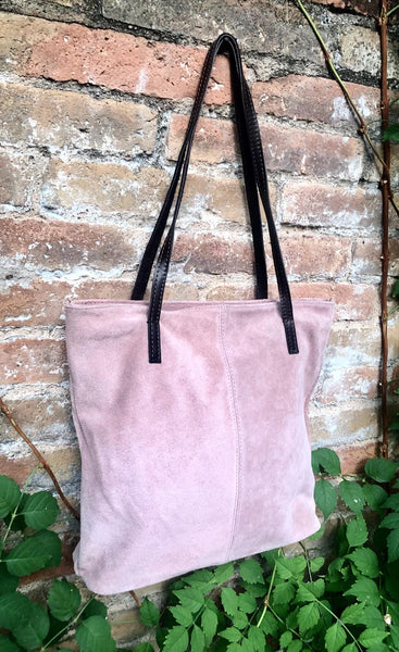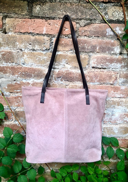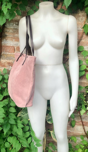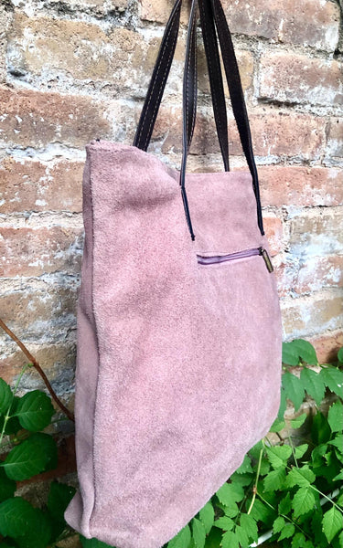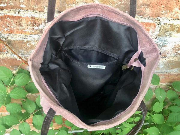 Dusty pink suede leather tote. Shopper suede bag in light pink with leather shoulder straps in dark brown, closed by a zipper at the top and an extra zipper closed pocket at the back. Suede tote made with natural genuine leather.