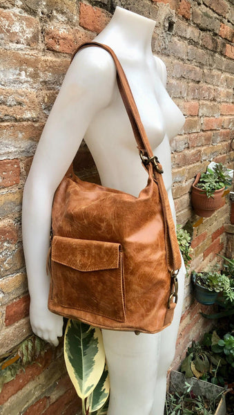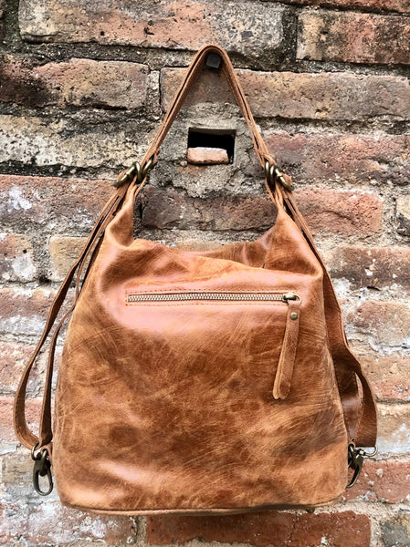 Genuine leather rucksack/ shoulder bag / crossbody in CAMEL BROWN. Soft genuine leather shopper. Carry all bag for laptops, tablets, books..